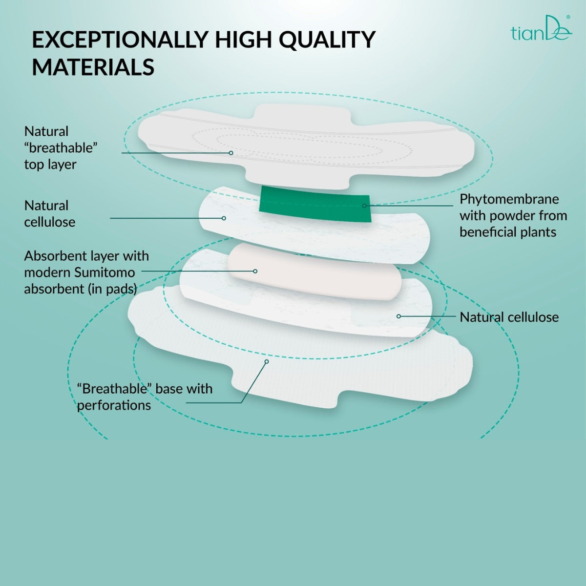 They contain a special phytomembrane with powder from plants beneficial to health. Artemisia, Cyperus rotundus and Angelica sinensis perform an antibacterial effect and prevent unpleasant odour.